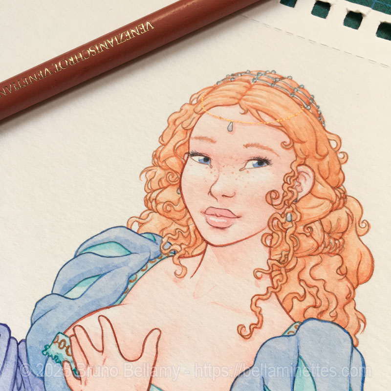 Après la reprise des contours à la couleur au pinceau fin et les rehauts à l’encre dorée sur les bijoux, l’ultime touche finale : les taches de rousseur avec le crayon Polychromos rouge (évidemment) vénitien, alias « Freckles Maker ». 😉