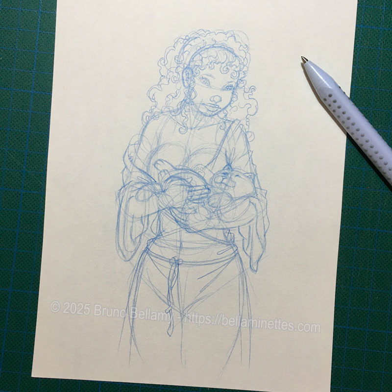 Voici (enfin !) l’ébauche à la mine bleue de ce qui sera la bellaminette pour les tipeuses et tipeurs de novembre (à paraître en décembre, donc) 🙂