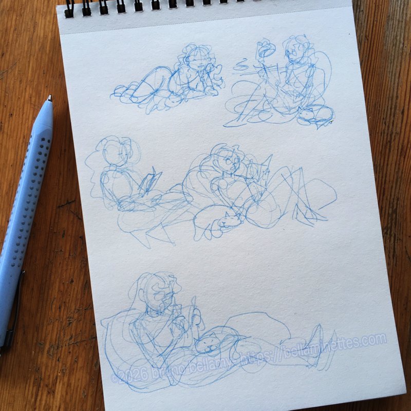 Recherches en cours (en mode « croquis rikiki ») pour la bellaminette destinée aux tipeuses et tipeurs d’avril, ambiance cocooning, lecture, et bien sûr gros chat ! 🙂